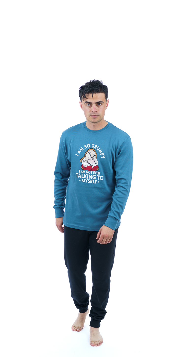 Βαμβακερή πυτζάμα ανδρική Sara. Σετ μπλούζα με λαιμόκοψη και διακοσμητικό τύπωμα και μονόχρωμο παντελόνι με λάστιχα στους αστραγάλους. Μαλακό και ζεστό ύφασμα interlock από 100% φυσικό βαμβάκι σε βαριά πλέξη με ελαστικότητα, χωρίς χνούδι εσωτερικά.