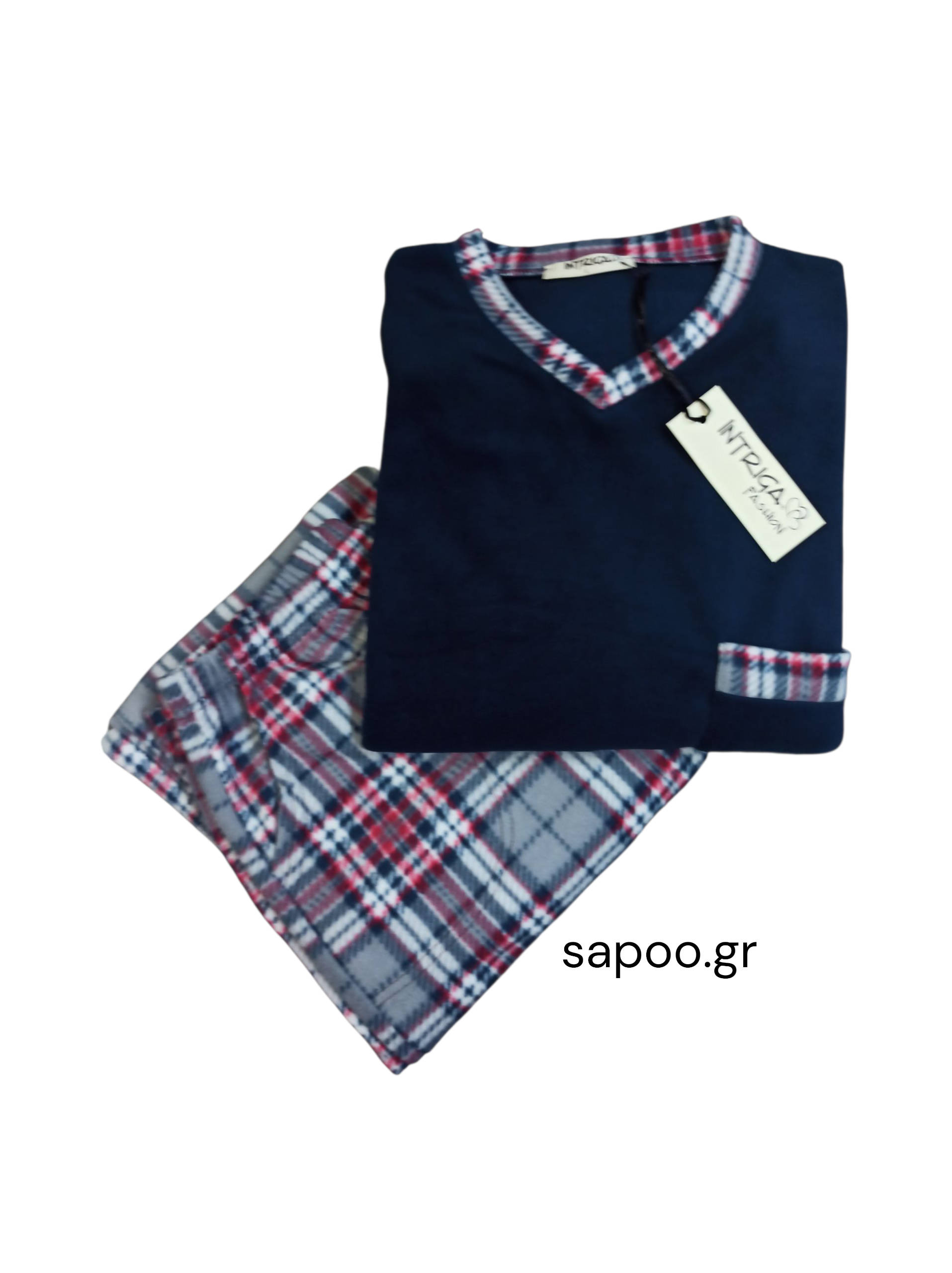 Ανδρική πυτζάμα φλις Intriga από πολύ ζεστό fleece. Σετ μπλούζα μπνόχρωμη με VE και καρό παντελόνι με τσέπες ίσιο, χωρίς λάστιχα στους αστραγάλους. Μαλακό και πολύ ζεστό ύφασμα φλις, σε πολύ καλή ραφή.