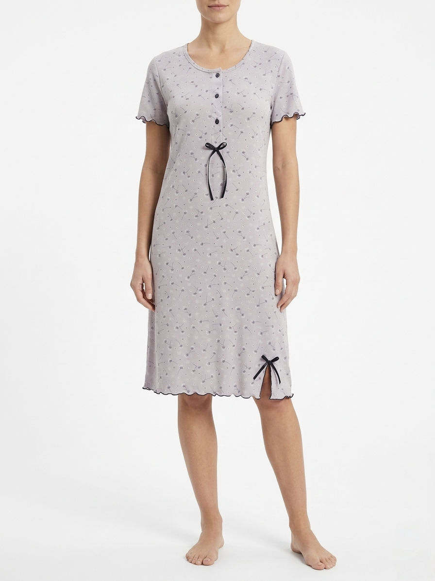 Νυχτικό ΝΙΝΑ κοντό μανίκι εμπριμέ. Κοντό, ίσιο κοντομάνικο νυχτικό με κουμπιά στο στήθος (πατιλέτα) και διακοσμητικό φιόγκο. Ελαφρύ, απαλό και πολύ δροσερό ύφασμα viscose με ελαστικότητα.