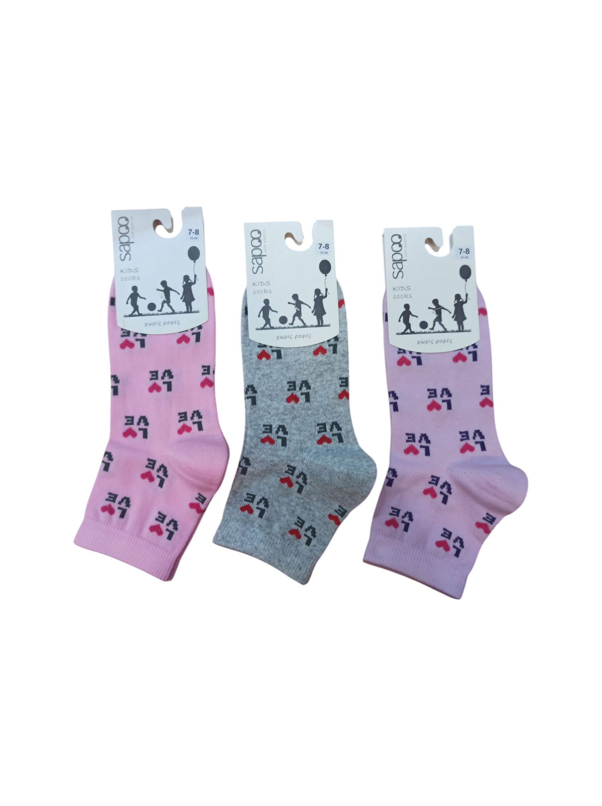 Βαμβακερές παιδικές κάλτσες με σχέδια για κορίτσι ημίκοντες ως το 1/4 γάμπας. Sapoo socks σειρά kids. Μεσαίο βάρος, ιδανικές για καθημερινή χρήση. Τρία ενισχυμένα στρώματα πλέξης προστατεύουν ομοιόμορφα ολόκληρο το πόδι, ενώ ένα επιπλέον στρώμα ενισχύει τα σημεία που χρειάζονται προστασία. Χωρίς ραφή στα δάκτυλα.