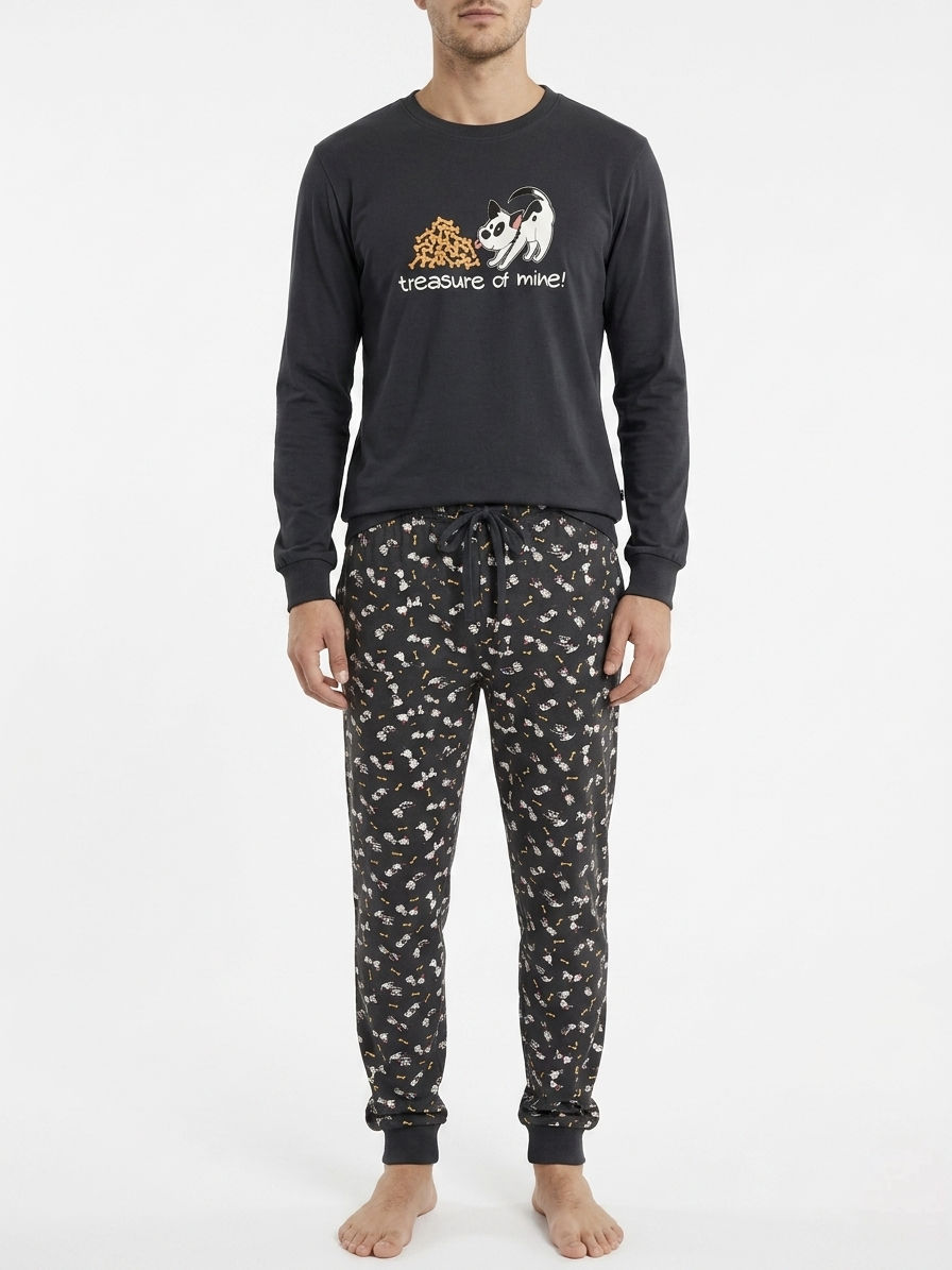 Ανδρική πυτζάμα APPLE βαμβακερή. Ανδρικές νεανικές πυτζάμες HOMEWEAR σετ μπλούζα με λαιμόκοψη και διακοσμητικό τύπωμα “SLEEP DOG”. Παντελόνι εμπριμέ allover print “DOG” με κορδόνι στη μέση και λάστιχα (μπάσκες) στους αστραγάλους. Μαλακό και ζεστό βαμβακερό ύφασμα σε πλέξη interlock μεσαίου βάρους, χωρίς χνούδι εσωτερικά.