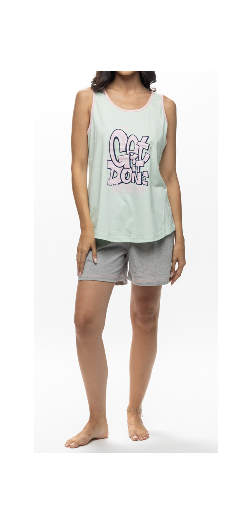 Βαμβακερή πυτζάμα κορίτσι εφηβική καλοκαιρινή GALAXY χωρίς μανίκι. Αμάνικη μπλούζα σε βεραμάν χρώμα με διακοσμητικό τύπωμα και μονόχρωμο γκρι μελανζέ σορτσάκι.