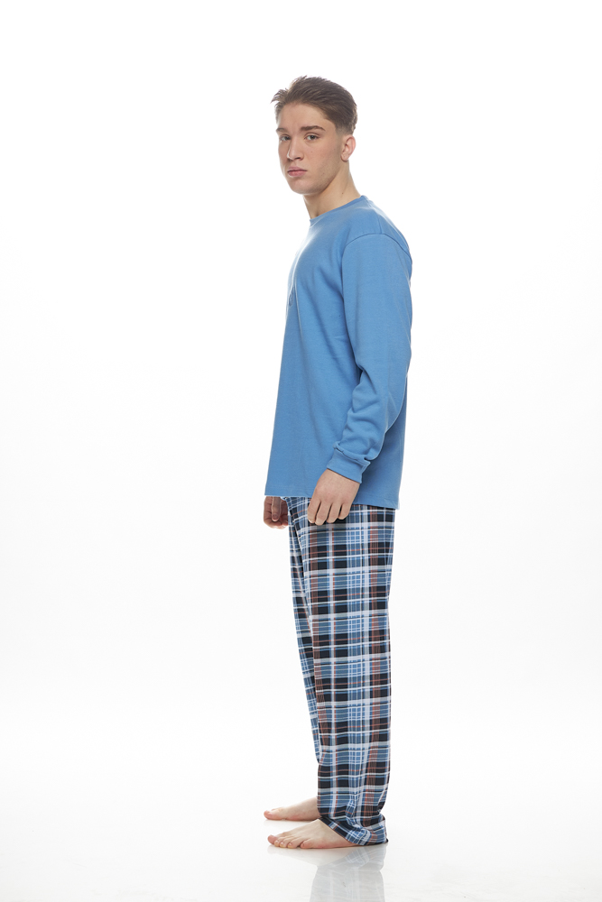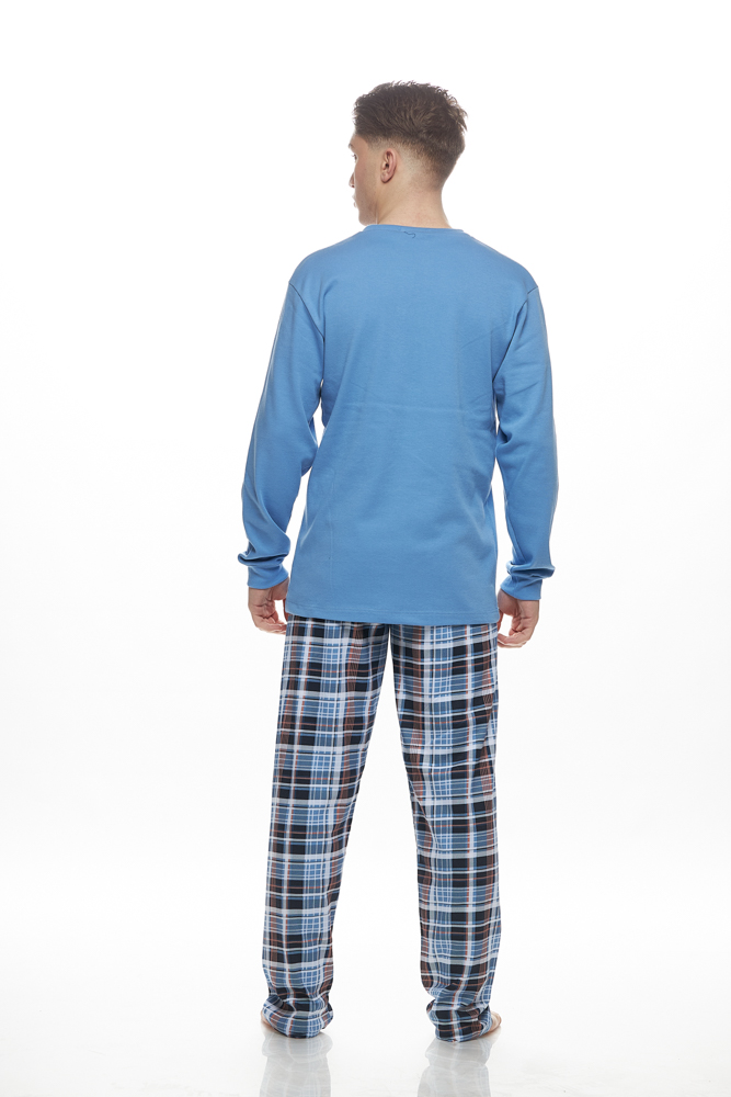 Ανδρική πυτζάμα Galaxy βαμβακερή με λαιμόκοψη. Σετ μονόχρωμη μπλούζα με διακοσμητικό κέντημα, λάστιχα στα μανίκια και καρό παντελόνι ίσιο, χωρίς λάστιχα στους αστραγάλους. Ιδιαίτερα μαλακό και ζεστό ύφασμα interlock από 100% φυσικό βαμβάκι σε βαριά πλέξη με ελαστικότητα, χωρίς χνούδι εσωτερικά.