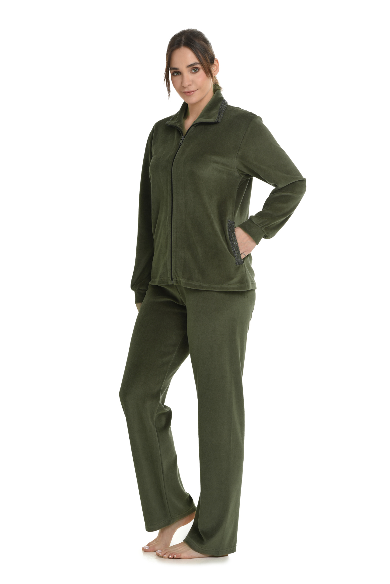 Βελούδινη φόρμα Primavera. Γυναικεία φόρμα με φερμουάρ και γιακά. Από βαμβακερό βελούδο υψηλής ποιότητας με διακοσμητική τρέσα. Ελληνικής κατασκευής στις εγκαταστάσεις της Primavera Lingerie στην Θεσσαλονίκη. Υψηλής ποιότητας μαλακό και ζεστό βαμβακερό βελούδινο ύφασμα που δεν κομπιάζει. Εξαιρετική ραφή για μέγιστη αντοχή και εφαρμογή.