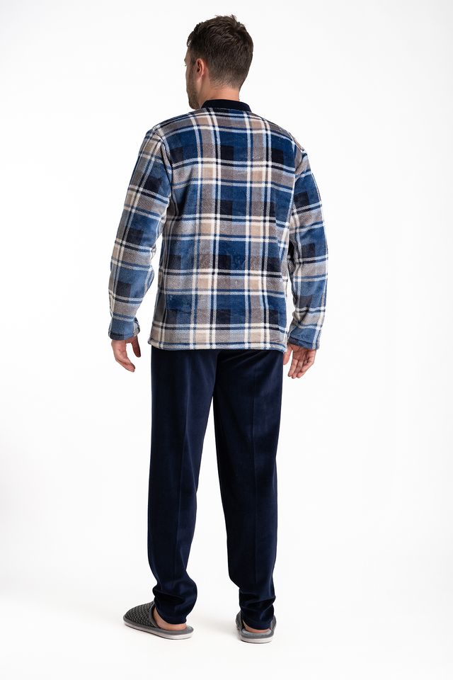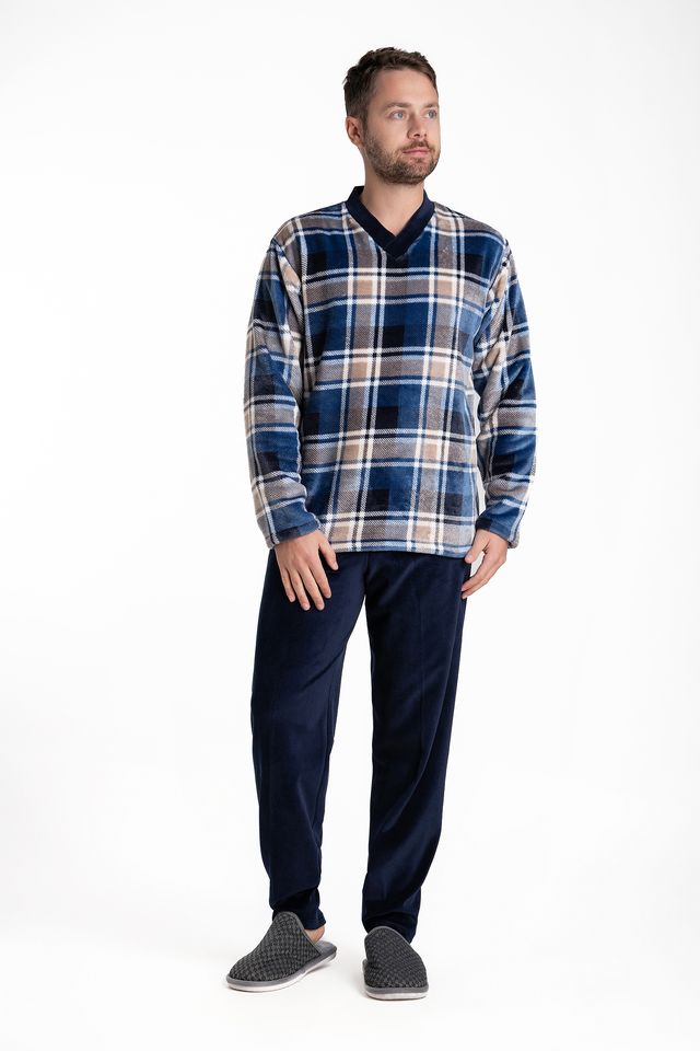 Ανδρική πυτζάμα φλις Relax. Μπλούζα από άριστης ποιότητας fleece με VE και μονόχρωμο μπλε σκούρο παντελόνι από βαμβακερό βελούδο. Πολύ απαλό και ζεστό ύφασμα με σχέδιο καρό. Άριστη ραφή με προσοχή σε κάθε λεπτομέρεια. Ύφασμα fleece, μαλακό και ζεστό!